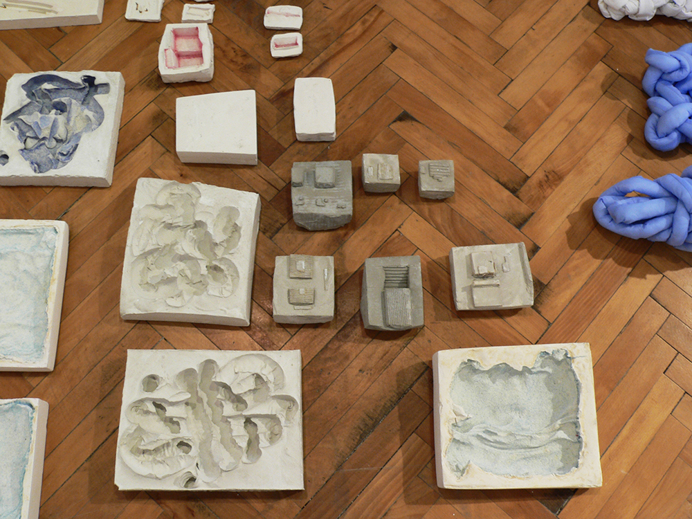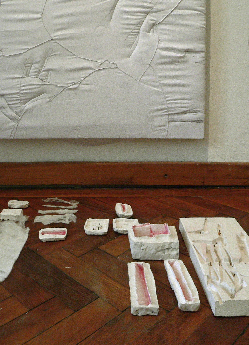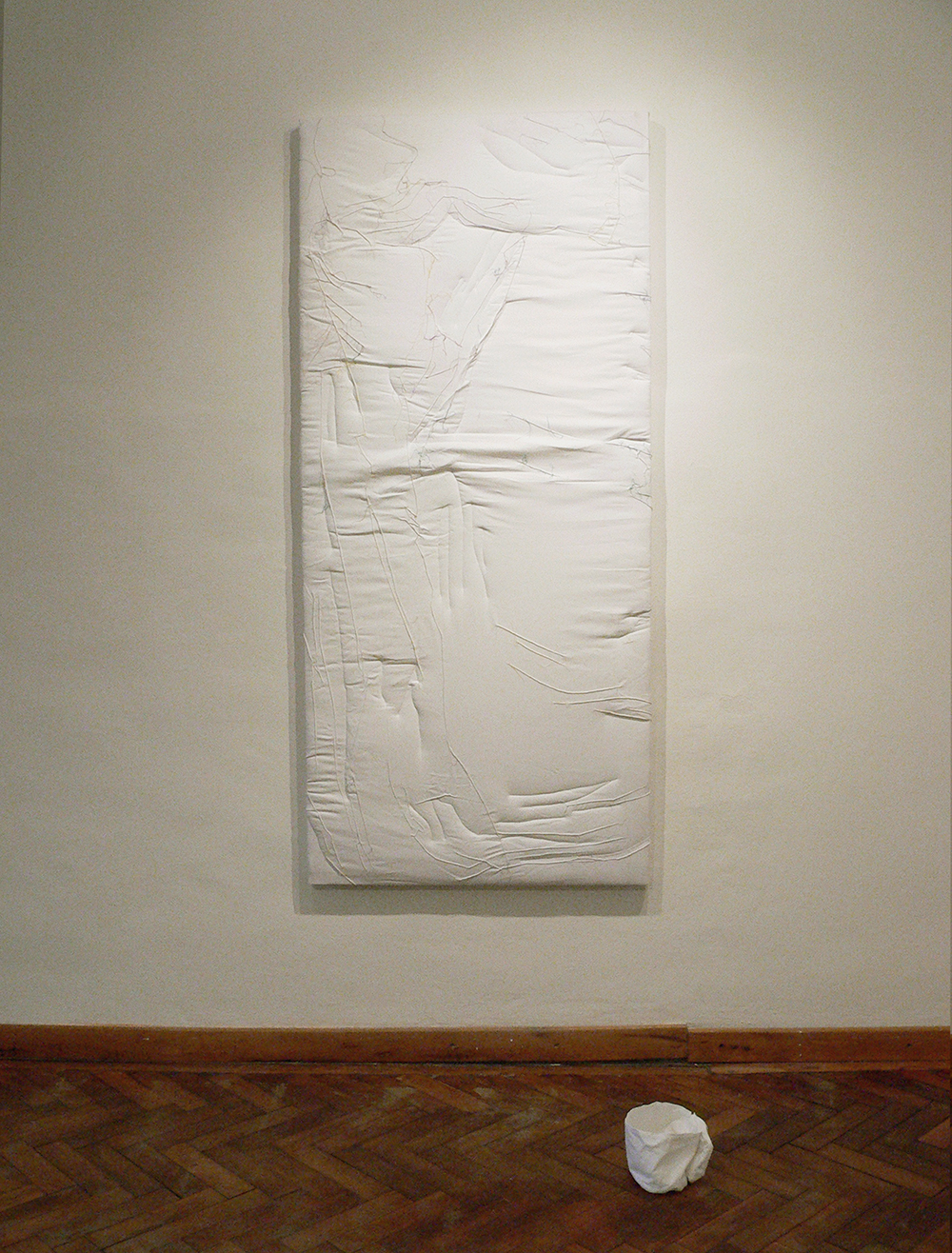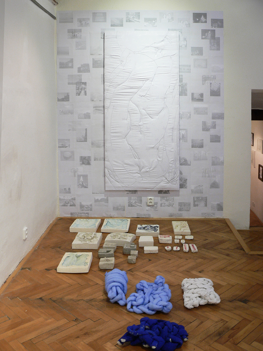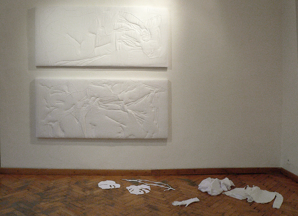 All parts of the installation, white (light grey in the case of concrete), only with exceptional use of colours (colourful threads, three blue pillows, imprints in moulds), refer to cleanness, sculptural monochrome materials and simplification which supports interaction between lights and shadows. Paintings-reliefs are layered from various materials and sewn to create the third dimension. I assigned objects to every image, which speak of care about one’s own body (cosmetic bag without zipper), worry about one’s things, property and other people (my diminished clothes), loving care for animals and plants (sewn white leaves) and about their non-functioning and uselessness concerning the passing time. The fourth group of objects contains different materials. Painting-relief is from different fabric than other three pieces, sewn with black thread; its background is filled with photographs of my travels, places and people I know. On the floor are objects created on educational stay in Brussels. They indicate new questions about a complex relationship to a place with its history, people and memories; and about its possible influence.