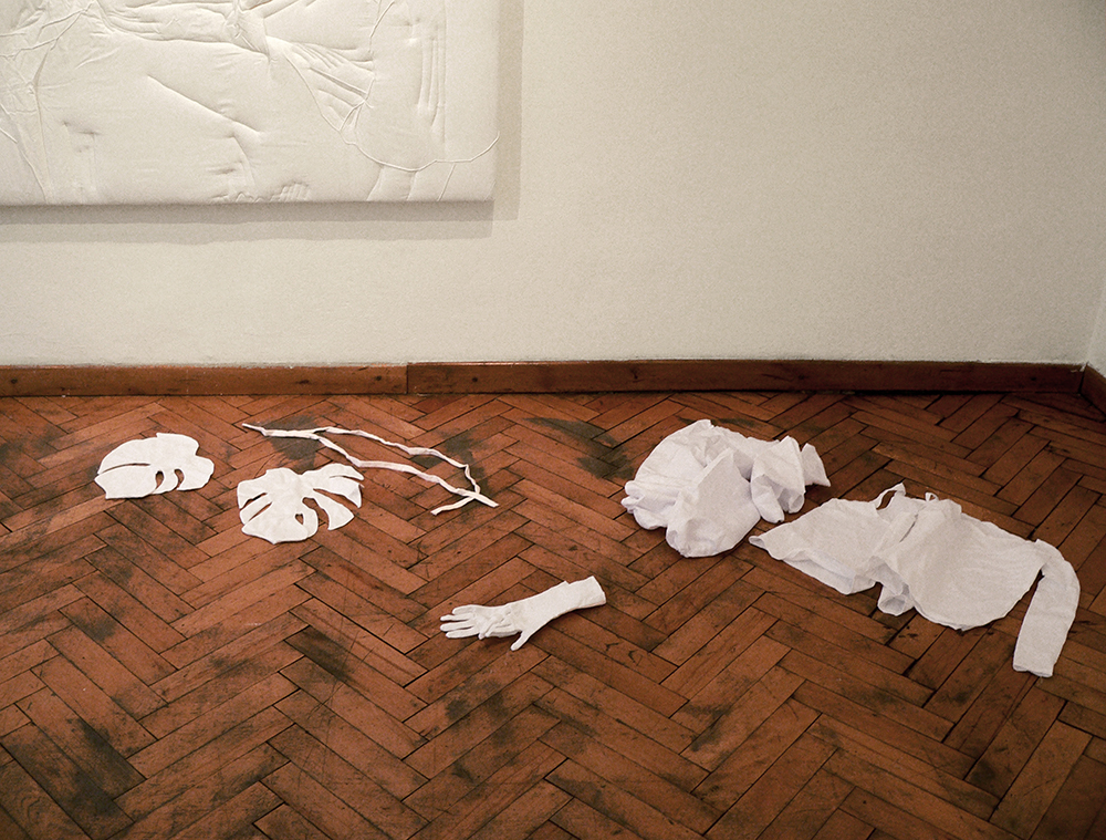 Všetky časti inštalácie, biele (svetlosivé v prípade betónu), len s výnimočným použitím farby (farebné nite, tri modré vankúše a odtlačky farebných látok vo formách), odkazujú na čistotu, sochárske jednofarebné materiály a zjednodušenie, ktoré podporuje hru svetla a tieňa. Obrazy-reliéfy sú navrstvené z viacerých materiálov a prešité, aby vytvorili jemný reliéf. Ku každému som priradila objekty, ktoré hovoria o starostlivosti o vlastné telo (kozmetická taška bez zipsu), starosti o vlastné veci, majetok, o druhých ľudí (moje zmenšené oblečenie), o nezištnej starostlivosti o zvieratá a rastliny (ušité biele kvety), a o ich nefunkčnosti alebo márnosti vzhľadom k času. Posledná skupina na rozdiel od predchádzajúcich obsahuje aj iné materiály okrem bavlnenej látky. Obraz-reliéf je z polyesterovej látky vyšitý čiernou niťou, pozadie mu tvoria čiernobiele fotky mojich známych a miest, ktoré som za posledné mesiace navštívila. Na zemi ich dopĺňajú objekty a odliatky už zo študijného pobytu v Belgicku. Naznačujú otázky o komplexnom vzťahu k miestu so svojou históriou, ľuďmi a spomienkami, o jeho možnom odlišnom vplyve.