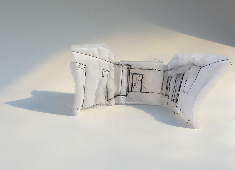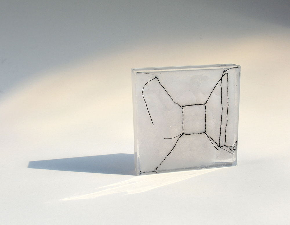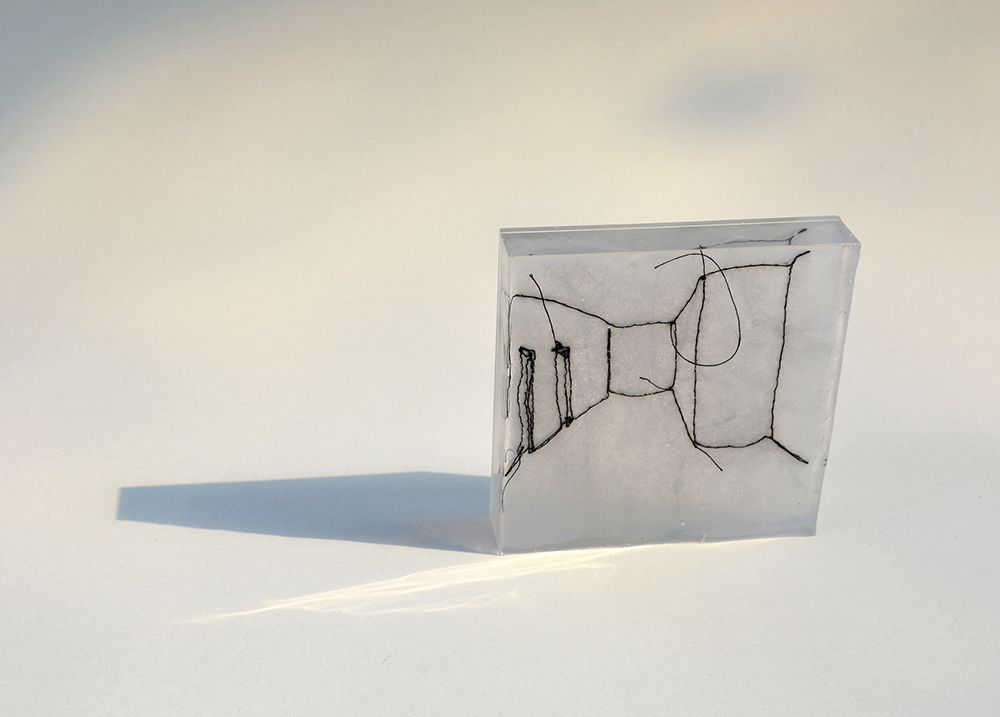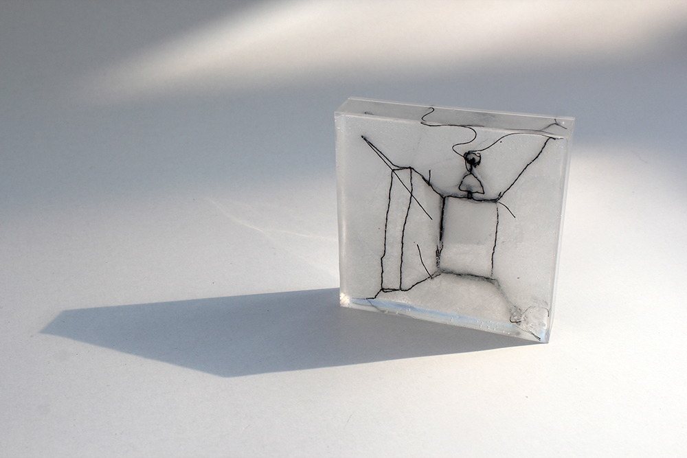 Mini-spaces combine sculpture and architecture. Minimized three-dimensional spaces are embroidered on textile, which is, with an extra soft layer, by itself three-dimensional, flexible and instable. The only solid part of the objects is transparent cube, in which part of the space is captured in stable form. Flats, indicated in simple lines, represent views through the corridors and doors into next spaces. They show the space, exits and entrances.