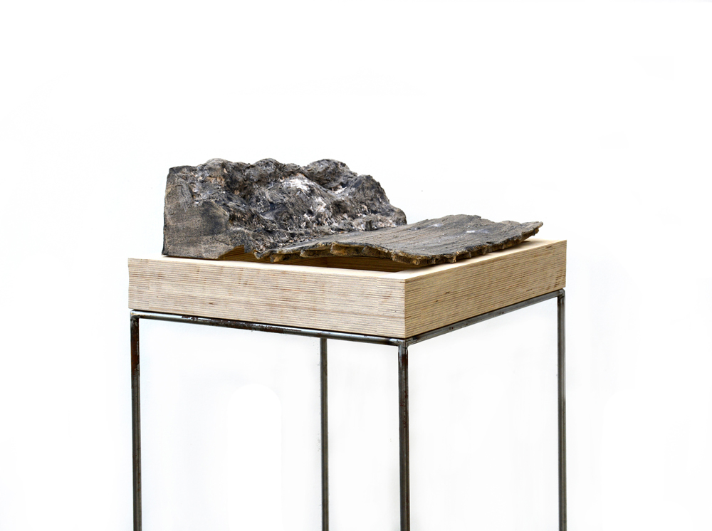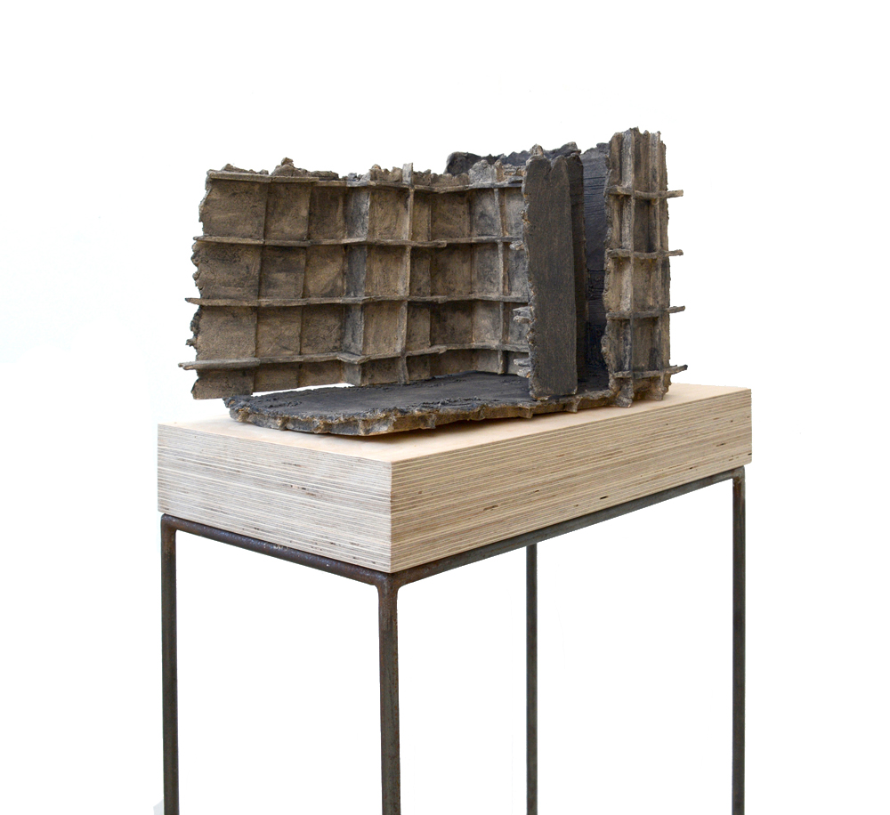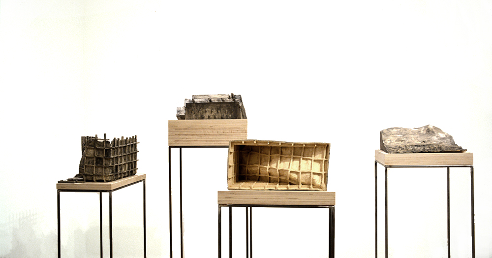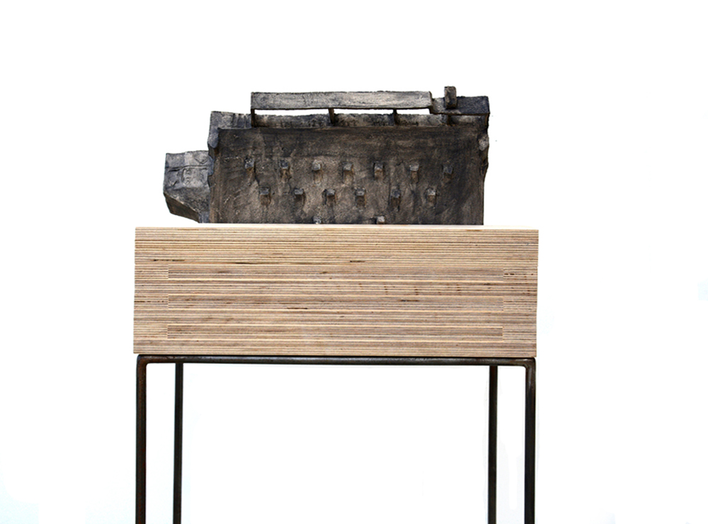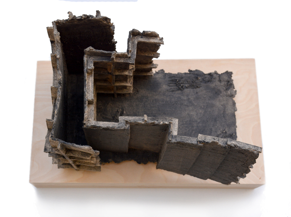 Objects are installed on wooden cubes – which represent layers (of memories), a base, or earth. These lie on subtle metal stands, welded of thin rod. Since they are interiors, houses and exteriors, they are modelled in different scales, adjusted to have similar measurements.